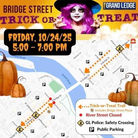 Get your costumes ready, Grand Ledge — it’s time for one of the most beloved community traditions of the year! The Bridge Street Trick-or-Treat is happening on Friday, October 24, 2025, from 5:00 to 7:00 p.m. in Downtown Grand Ledge. 👻🍬