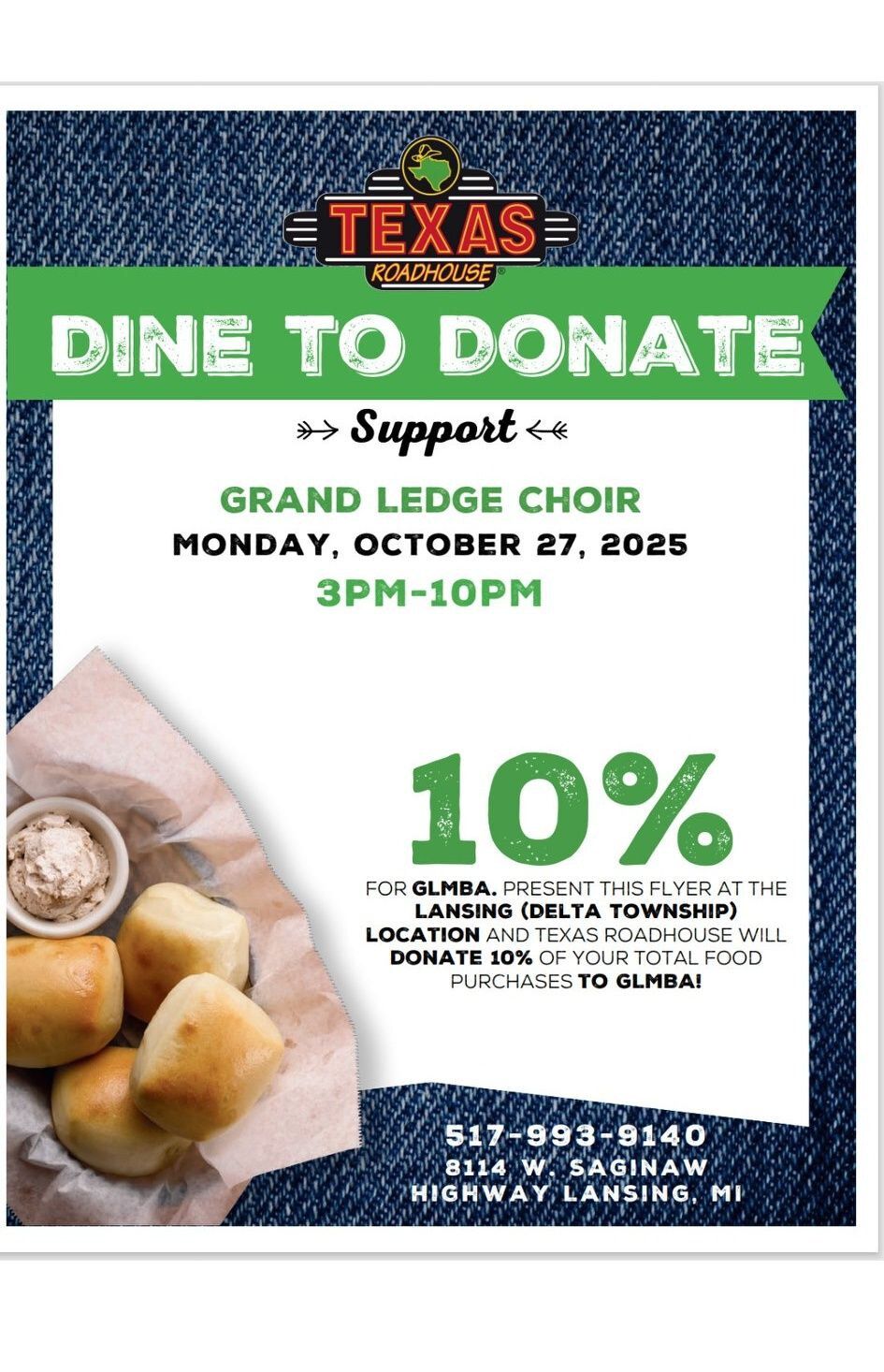 On Monday, October 27, 2025, from 3:00 PM to 10:00 PM, families, friends, and community members can enjoy dinner at the Delta Township Texas Roadhouse — and 10% of qualifying food purchases will be donated to support Grand Ledge choir students and their musical journey. 🍽️🎵