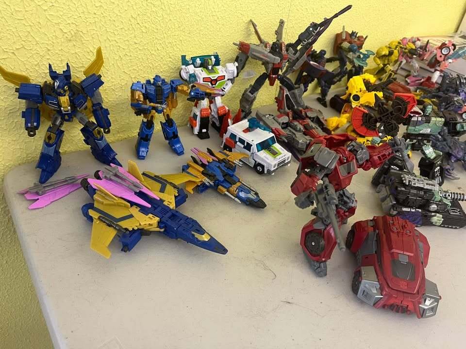 Local man is selling is collection of Transformers Action Figures. His collection includes several versions of Megatron and Optimus Prime as well as other notable characters like Starscream and others.