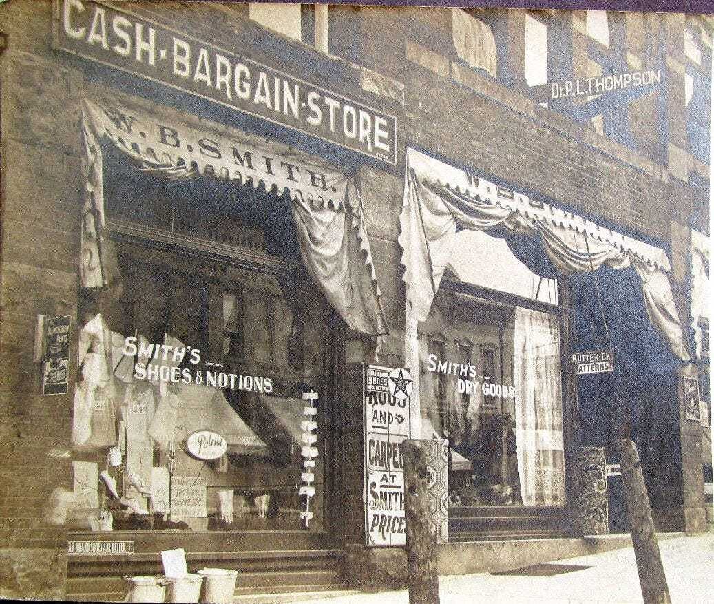 The storefront, with its bold hand-painted signs and fabric awnings, radiates that timeless small-town charm. Inside, shoppers would have found everyday essentials — everything from fabrics and household goods to shoes and buttons — all “at Smith prices.” 🏷️