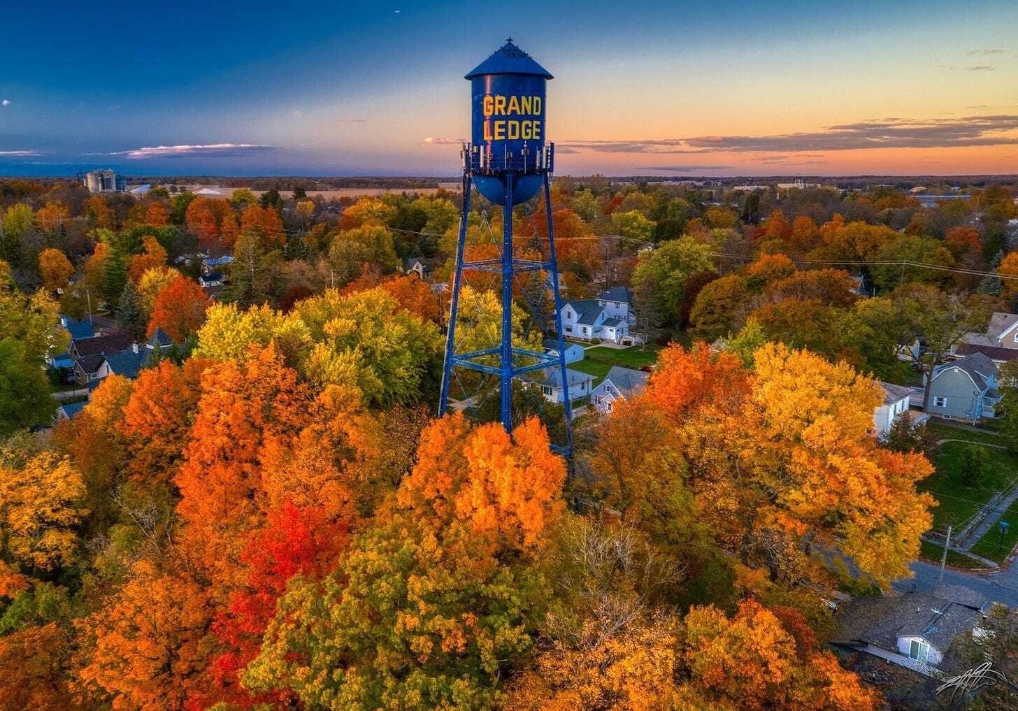 The third photo centers on Grand Ledge’s beloved blue water tower, proudly watching over the town as the sun sets. Surrounded by the fiery hues of fall, it’s both a landmark and a symbol of hometown pride. Whether you’re driving down Bridge Street or returning home after a long day, that tower always says, “You’re back where you belong.” 💙