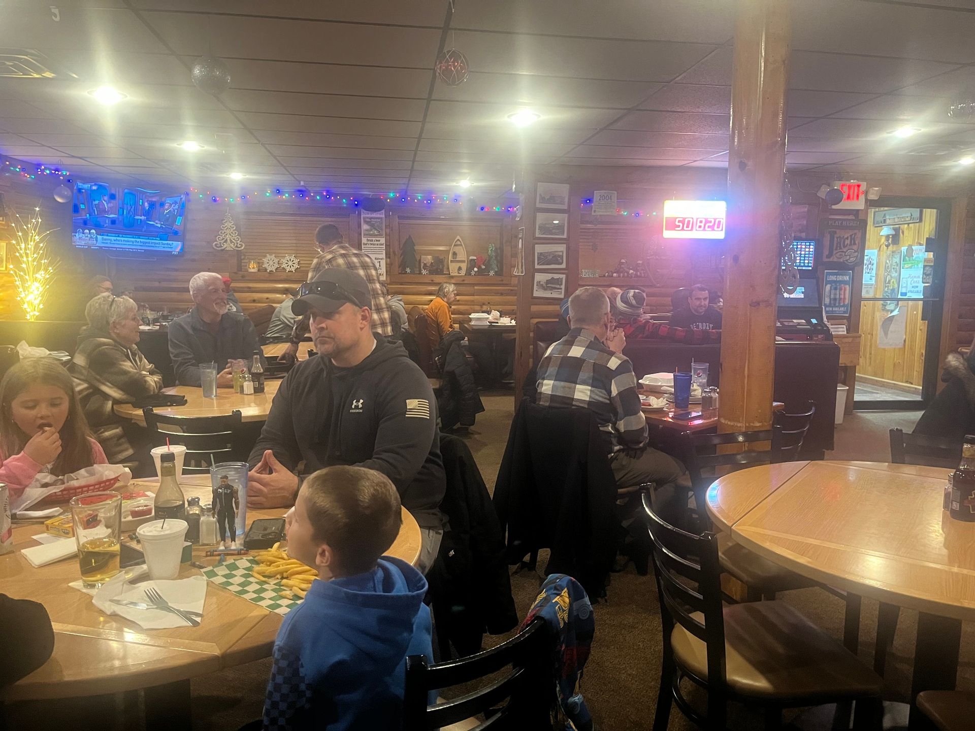 There are tan log beams everywhere. They have a fireplace. And they have a wood bar like most restaurants.